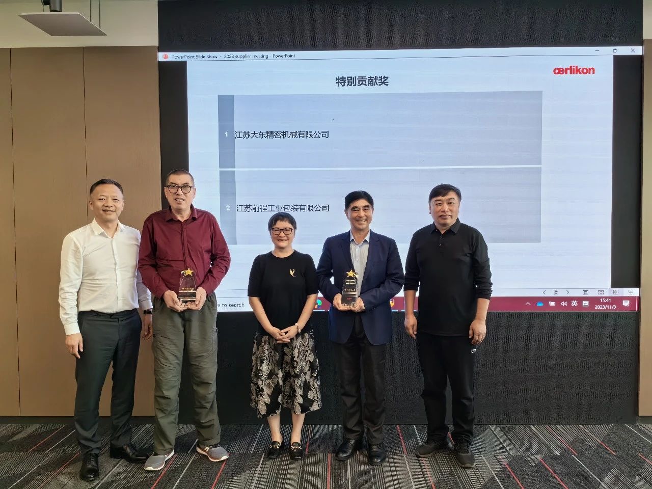 2023年11月3日,在ORK 2023供應(yīng)商會(huì)議上,客戶(hù)對(duì)前程包裝公司多年來(lái)提供高質(zhì)量的產(chǎn)品和卓越的服務(wù)支持,尤其在去年疫情期間,攻堅(jiān)克難,鼎力相助,持續(xù)保障木包裝箱的及時(shí)供應(yīng)充分肯定,給予頒發(fā)“特別貢獻(xiàn)獎(jiǎng)”。前程包裝董事長(zhǎng)徐平先生出席會(huì)議并代表領(lǐng)獎(jiǎng)。